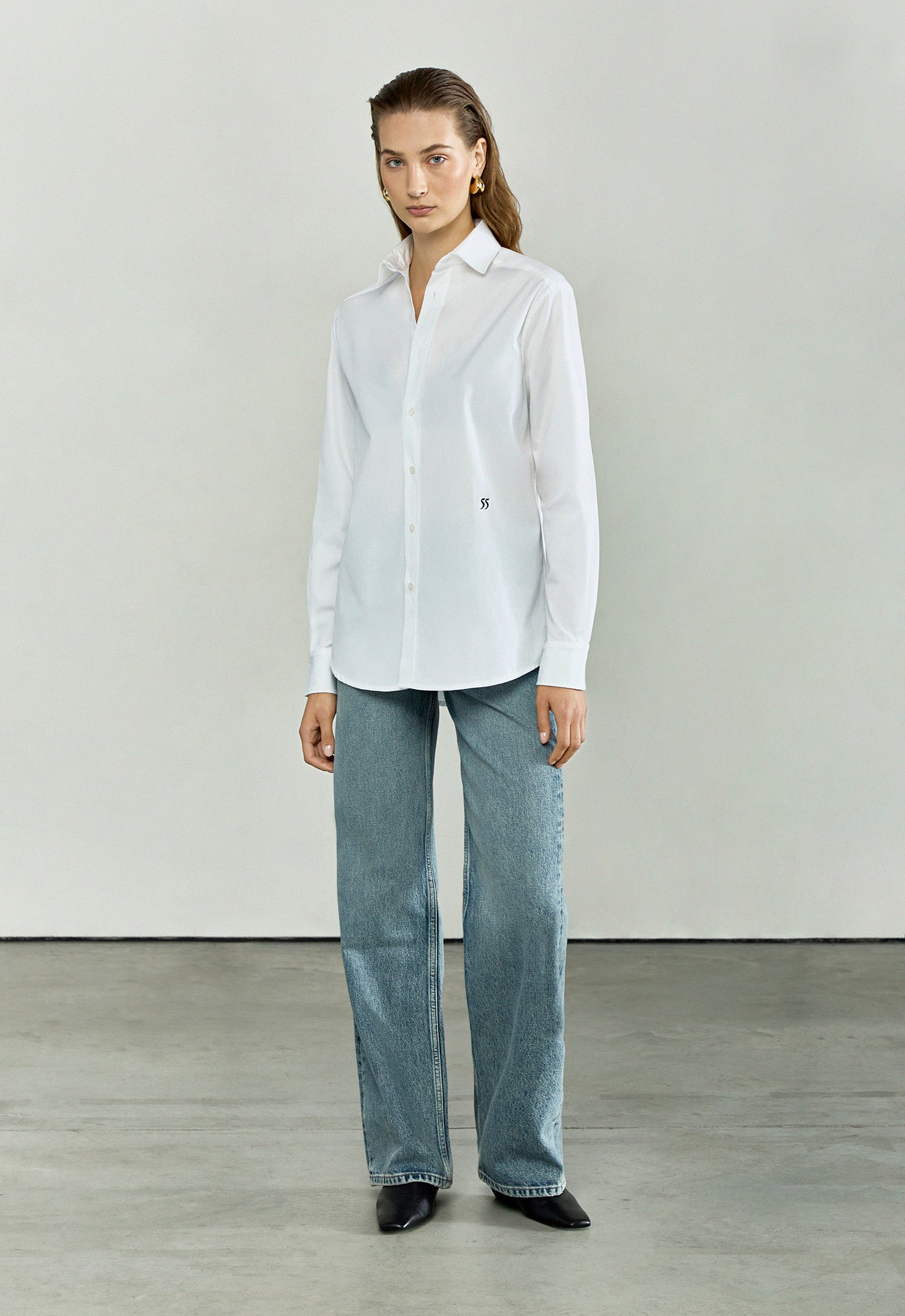 This is a relaxed fit button-up shirt with button-closure sleeve cuffs. It's made from crisp, breathable 100% high-quality cotton poplin with a black embroidered logo: a quiet nod to the brand. Finished with long sleeves and rounded cuffs, just in case you feel like rolling them up and getting stuff done (or not - no pressure).